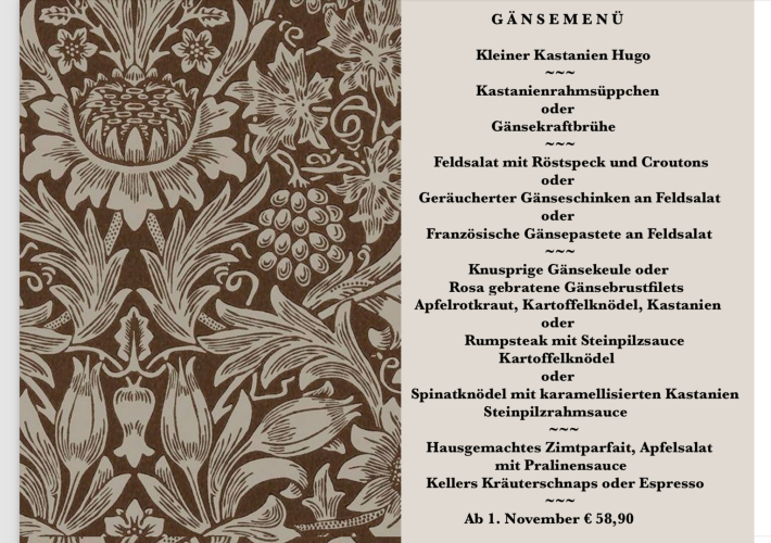 Es gibt auch unsere Gänsegerichte À la carte, zusätzlich ist noch unsere vielfältige Speisekarte gültig.